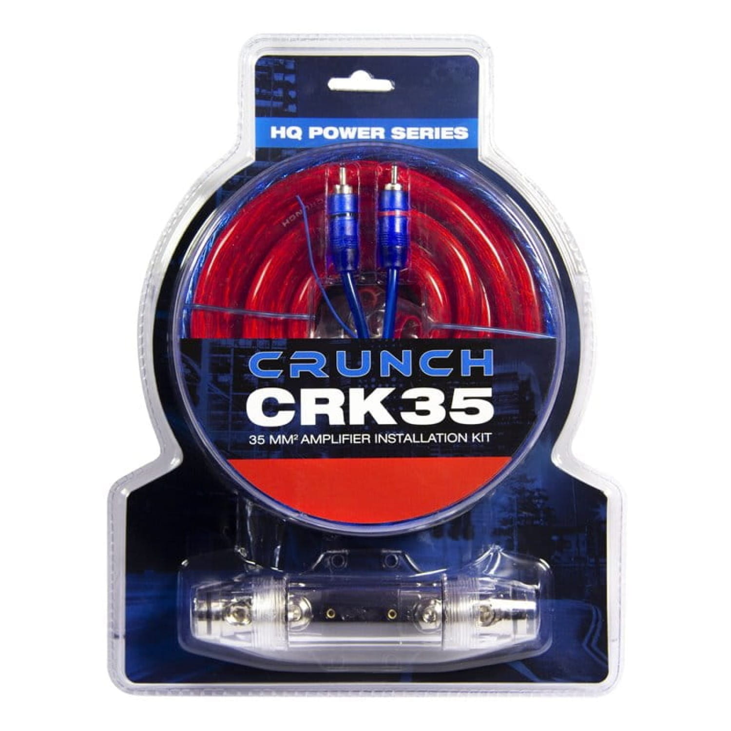 Crunch CRK35 to kompletny zestaw instalacyjny z przewodami 35 mm², ekranowanym kablem RCA i bezpiecznikiem ANL 150 A. Idealny do montażu wzmacniacza o dużej mocy – zapewnia stabilne zasilanie, bezpieczeństwo i perfekcyjny dźwięk.