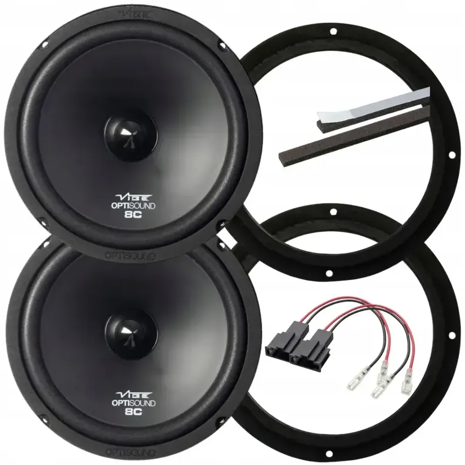 Kompletny zestaw głośników VIBE OPTISOUND 8C dedykowany do przednich drzwi Audi A4 B8, A5, A6 C7 i Q5 I gen. pozwala na szybki montaż Plug & Play. Dzięki lekkiej membranie i wysokiej skuteczności głośniki oferują czysty wokal i mocny bas, idealnie dopasowany do fabrycznej instalacji lub wzmacniacza.